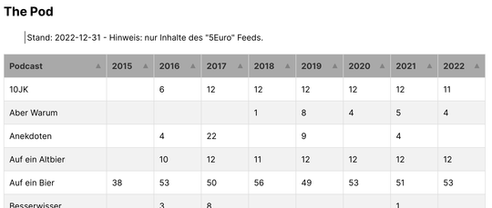 Gehen wir nun davon aus, dass jeder Podcast einer Kategorie zugeordnet werden kann (Fundbüro, M10Z etc.), können wir einfach den kompletten Feed einlesen und alle einzelnen Folgen auf Basis ihres Titels zählen, kategorisieren und in Monate und Jahre unterteilen. Gesammelt und als Tabelle (Screenshot von The Pod, da diese eine interessante Datenbasis besitzen) dargestellt, lässt sich so eine simple Jahresübersicht pro RSS-Feed erstellen.